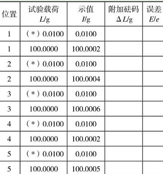 例:現(xiàn)有一臺(tái)電子天平,其最大秤量為220g,實(shí)際標(biāo)尺分度值d=0.1mg,檢定標(biāo)尺分度值e=1mg。根據(jù)JJG1033-2006《電子天平檢定規(guī)程》的規(guī)定,應(yīng)該選擇最大秤量220g的1/3,同時(shí)優(yōu)先選擇單個(gè)砝碼。即用100g的標(biāo)準(zhǔn)砝碼檢定天平的偏載(四角)誤差,所測(cè)得的有關(guān)數(shù)據(jù)如表1所示。求此電子天平的偏載誤差是多少?天平的偏載(四角)誤差是否合格?
