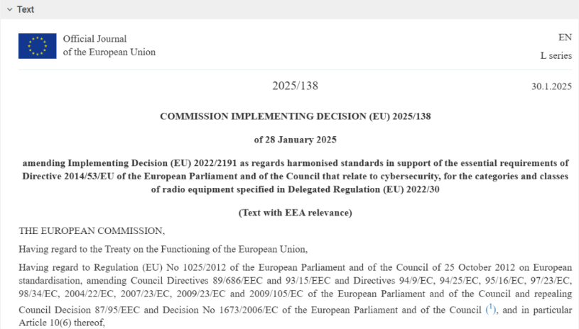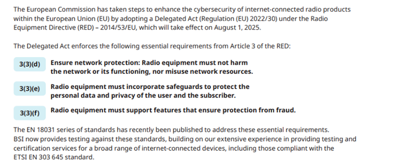 2025年1月30日,歐盟委員會正式將EN 18031標準列入《歐盟官方公報》(OJ)的《無線電設備指令》(RED)協調標準清單。該法案將于2025年8月1日正式實施,屆時無線電設備必須符合RED指令第3(3)條(d)、(e)和(f)點的網絡信息安全要求才能進入歐盟市場銷售。