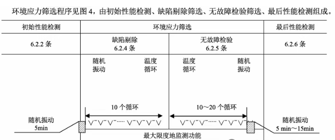 篩選過程中應對產品的功能和性能進行監測,在最長 20個循環內只要連續10個循環不出現故障,產品即通過了溫度循環篩選;在最長15min內連續 5min不出現故障,產品即通過了隨機振動篩選。