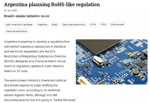 2020年6月24日,阿根廷宣布正在計劃制定一項限制電子電氣設備中有害物質的法規, 類似于歐盟的RoHS。根據技術專家的意見,當局近期或將開始起草此法規。