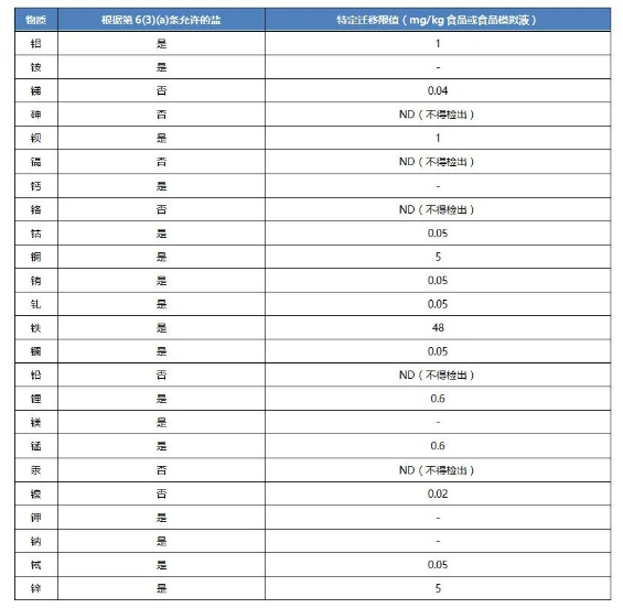 以下是關(guān)于上表1的一些要點(diǎn):重金屬特定遷移的元素種類從原有的9種(鋇、鈷、銅、鐵、鋰、錳、鋅、鋁、鎳限值不變)增至24種(新增銨、銻、砷、鎘、鈣、鉻、銪、釓、鑭、鉛、鎂、汞、鉀、鈉、鋱),其中4種鑭系元素(銪、釓、鑭、鋱)的限值為0.05mg/kg,砷、鉻、鉛、汞的限值為不得檢出(0.01mg/kg),鎘為不得檢出(0.002mg /kg),其他元素沒有限值要求。