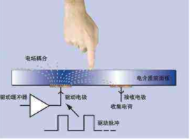 當手指觸摸在金屬層上時,由于人體電場,用戶和觸摸屏表面形成以一個耦合電容,對于高頻電流來說,電容是直接導體,于是手指從接觸點吸走一個很小的電流。這個電流分別從觸摸屏的四角上的電極中流出,并且流經這四個電極的電流與手指到四角的距離成正比,控制器通過對這四個電流比例的精確計算,得出觸摸點的位置。