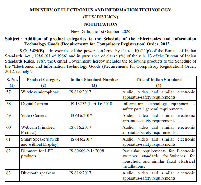 2020年10月1日,印度電子和信息技術部(MEITY)發(fā)布了第五階段"在《電子和信息技術商品(強制注冊要求)令》附表中增加產(chǎn)品類別"。以下產(chǎn)品類型需從2021年 4 月 1 日起在印度獲得印度標準局 (BIS) 安全認證: