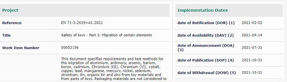 標準EN 71-3:2019+A1:2021將被賦予CEN成員國國家標準的地位,與其相沖突的國家標準將最晚在2021年10月31日被取代。該標準預計不久會得到歐盟委員會批準,在歐盟官方公報(OJEU)上發(fā)布之后,被列為玩具安全指令2009/48/EC的協(xié)調標準。目前相應的生效的協(xié)調標準仍然為EN 71-3:2019。