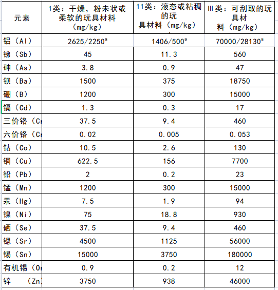 ● I類玩具材料:鋁的遷移限值從5625 mg/kg變?yōu)?250 mg/kg;