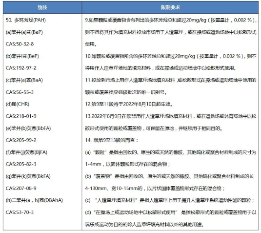 2021年7月21日,歐盟在其官方公報(bào)發(fā)布新法規(guī)(EU) 2021/1199,修訂歐盟REACH法規(guī)((EC) No 1907/2006)附件XVII第50條目,新增在人造草坪、操場(chǎng)或運(yùn)動(dòng)場(chǎng)地中用作填充物的顆粒或覆蓋物中多環(huán)芳烴(PAHs)的限制。該新法規(guī)將于歐盟官方公報(bào)發(fā)布后第20天生效。