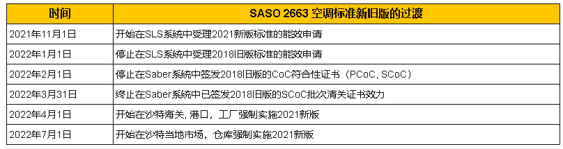 2021年8月23日,沙特標準局SASO正式公告了空調能效 SASO 2663新舊版標準的執行過渡期,請相關廠商關注標準執行的重要時間點,盡快在標準過渡期內完成新標準測試并及時更新能效證書。