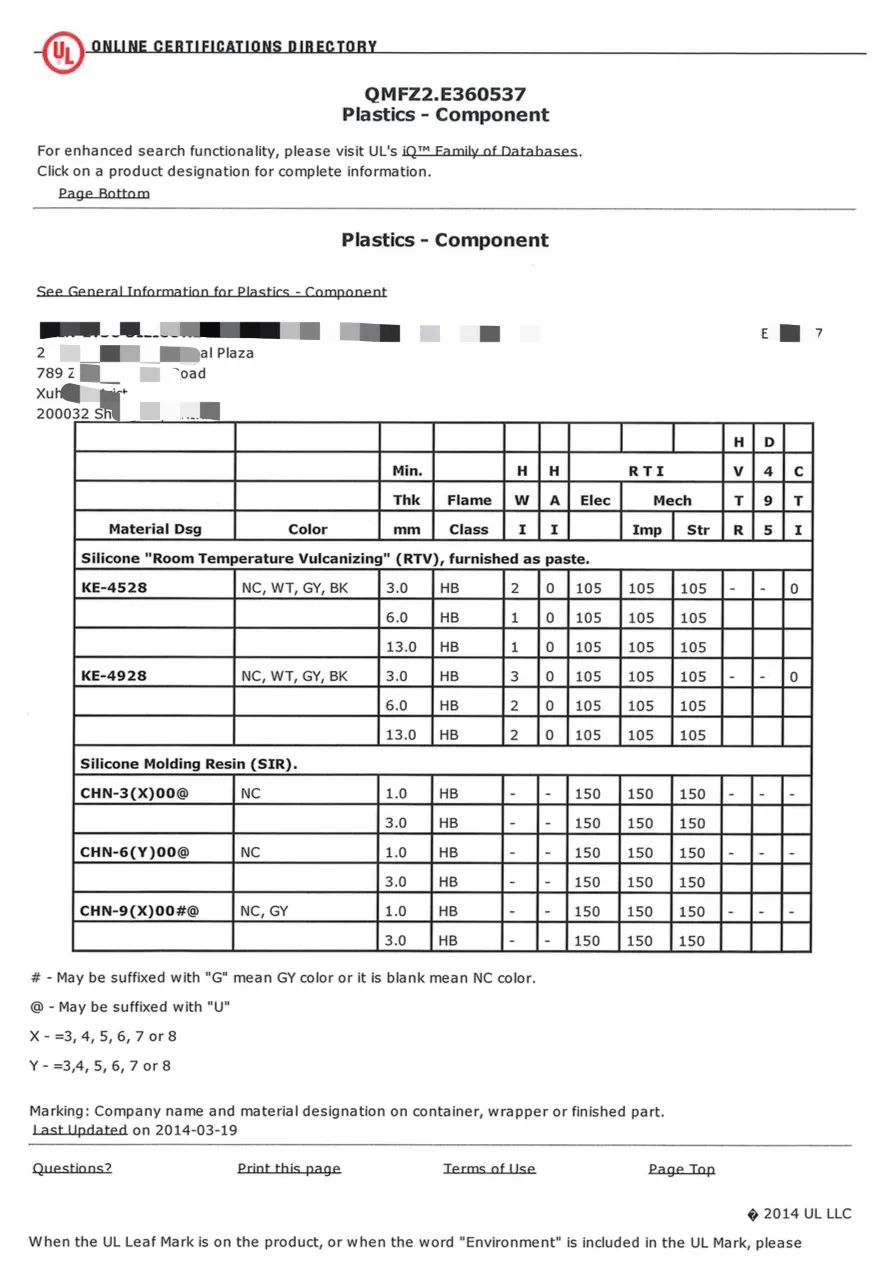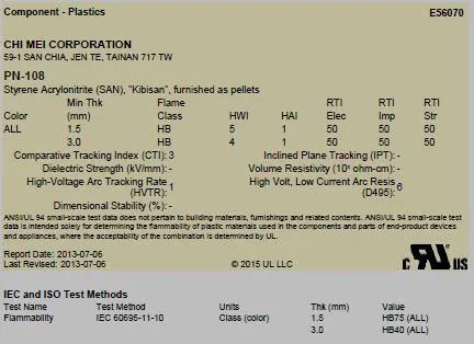 NC為天然色(無著色的顏色)BK為黑色ALL為全部顏色。Min.Thick.試片最小厚度單位為mm。在上述黃卡中,試片厚度為3mm時,難燃性為5VA。試片厚度為1mm時,難燃性為5VB。