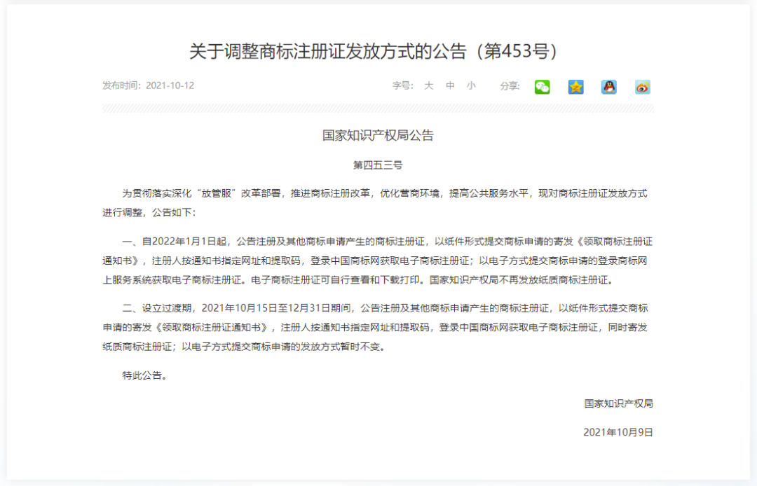 紙質(zhì)商標(biāo)證將從2022年1月1日起告別市場(chǎng) 據(jù)此前國(guó)家知識(shí)產(chǎn)權(quán)在官方網(wǎng)站發(fā)布的第453號(hào)公告顯示,自2021年1月1日起,國(guó)家知識(shí)產(chǎn)權(quán)局不再發(fā)放紙質(zhì)商標(biāo)注冊(cè)證,電子版商標(biāo)注冊(cè)證將代替紙質(zhì)化證書。過渡期為2021年10月15日至12月31日期間。